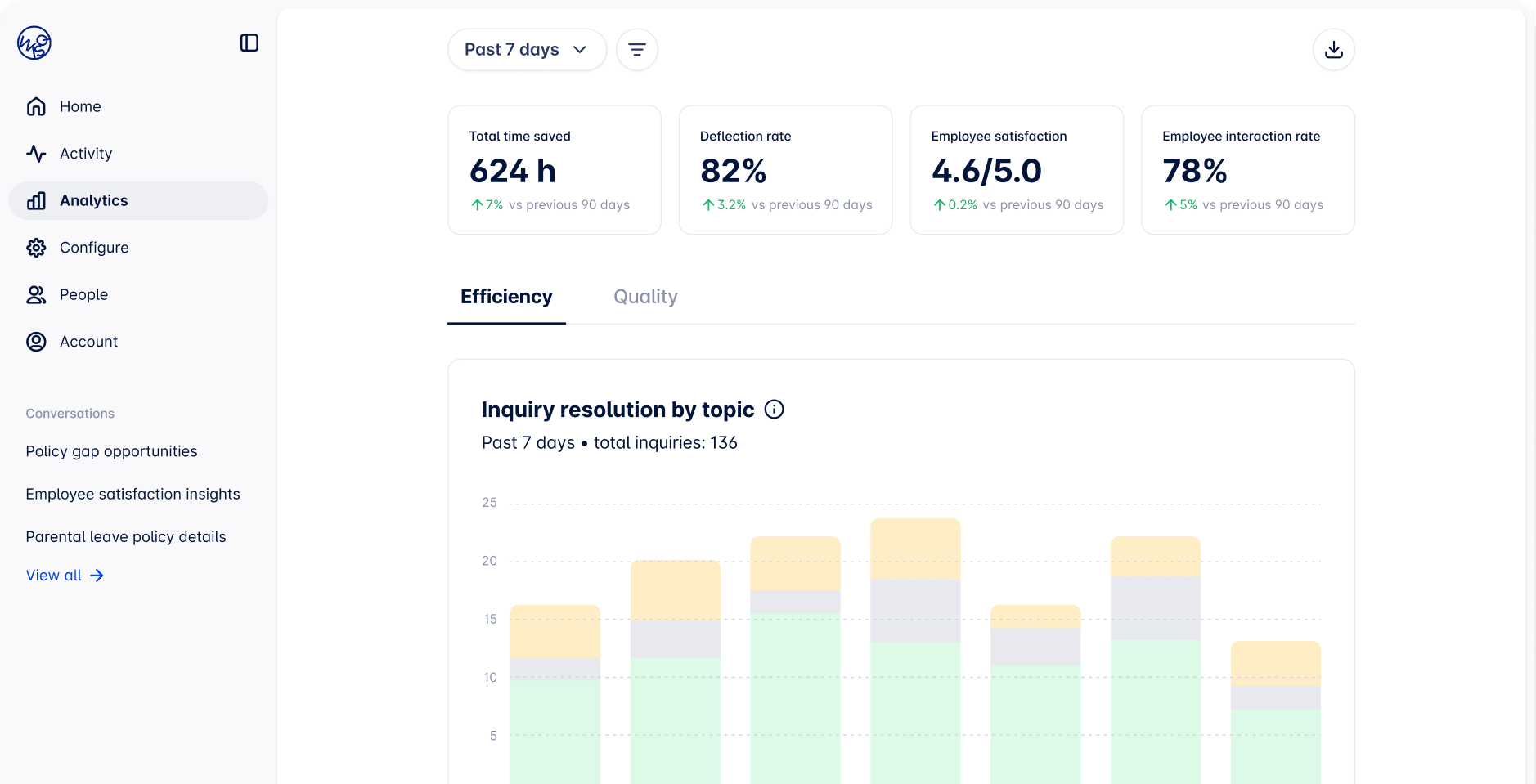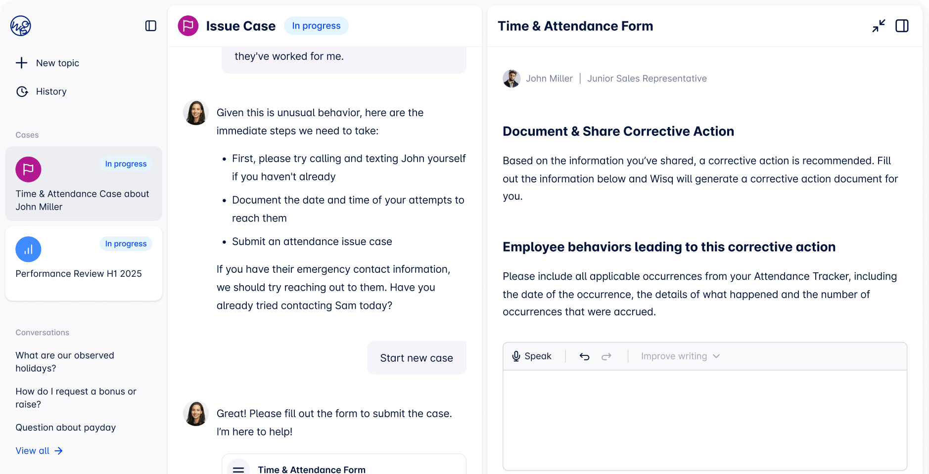 Wisq handles intake for all HR requests—whether through chat, email, ticketing systems, or your company apps—automatically triaging and resolving inquiries 24/7/365 to deliver rapid, reliable employee support at scale.